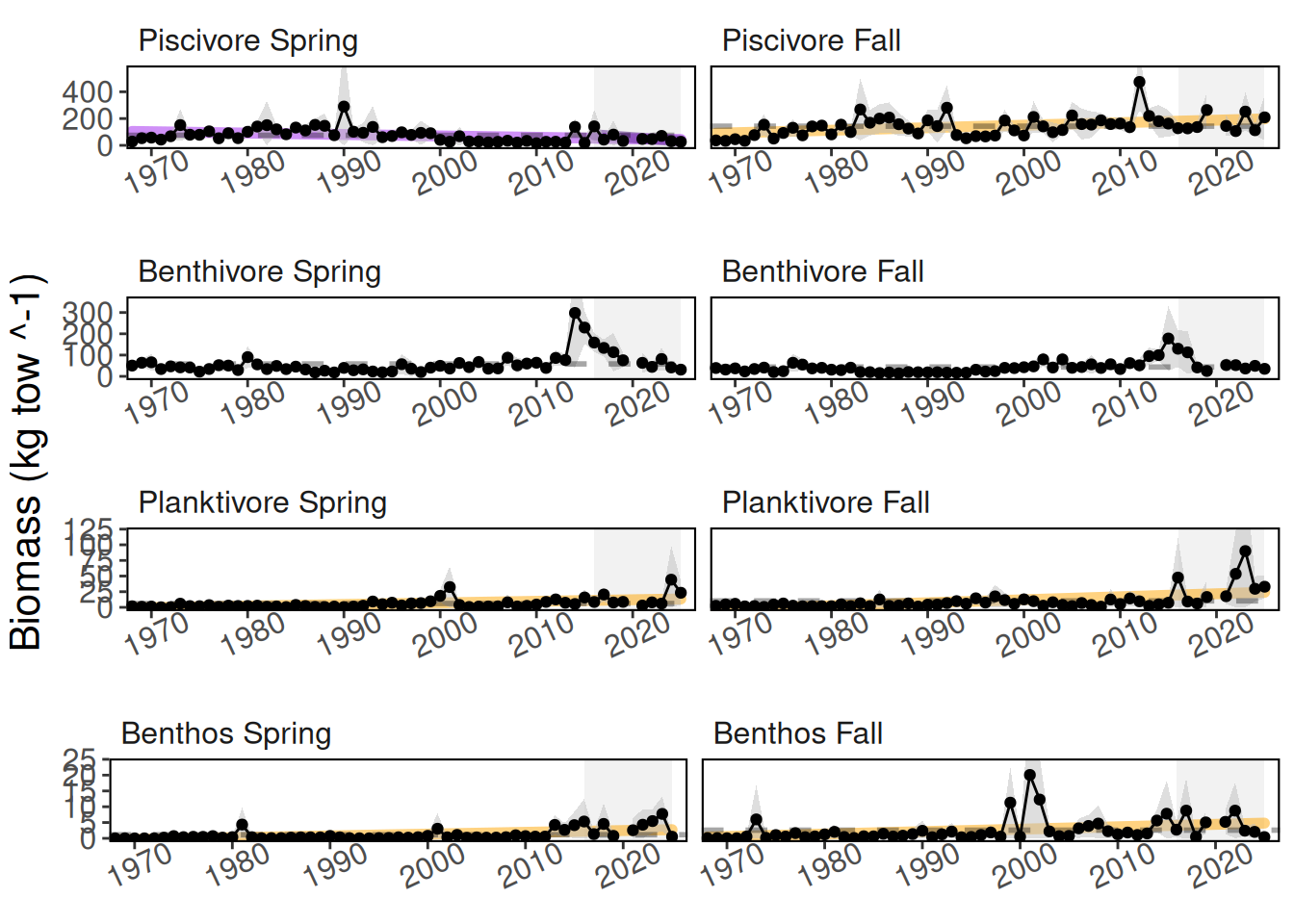 - Name: Guild Season Biomass Index; Description: Stratified mean biomass index of an aggregate group of species. Guilds include Benthivore, Benthos, Other, Piscivore, and Planktivore. Season is either Spring or Fall. For example “Benthivore Spring Biomass Index”; Units: kg tow^-1