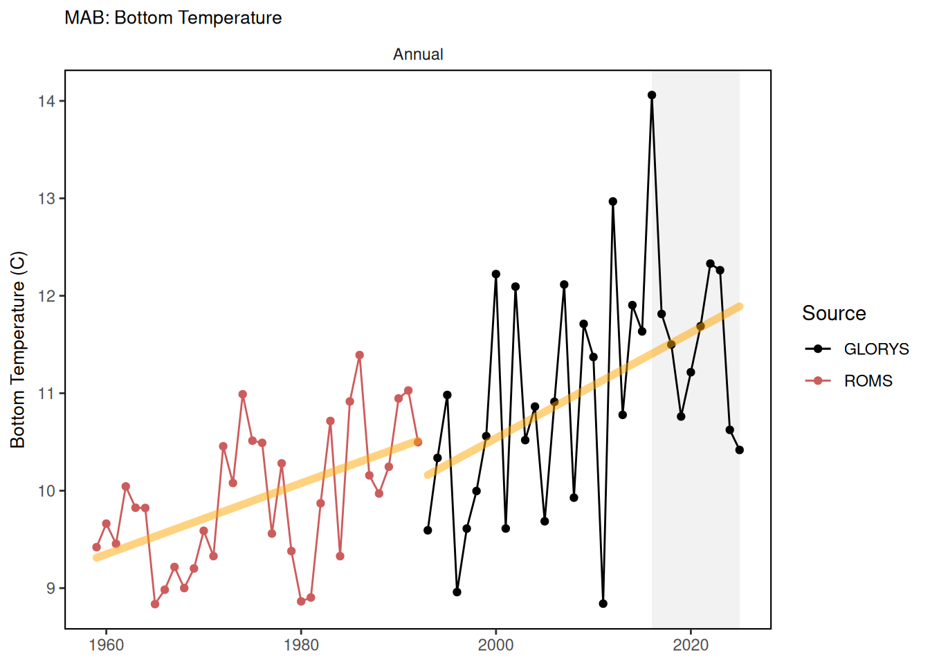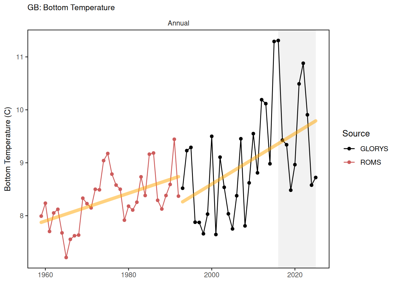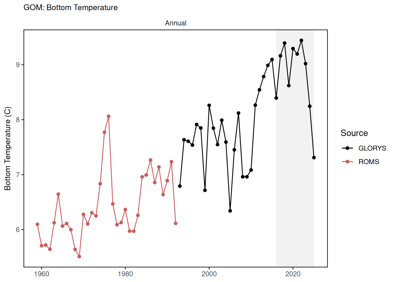 Bias-corrected ROMS-NWA (ROMScor) between 1959 and 1992 which was regridded in the same 1/12degree grid as GLORYS using bilinear interpolation; GLORYS12v1 in its original 1/12 degree grid between 1993 and 2024-09-10; and PSY in it’s 1/12 degree grid from 2023-08-29 to 2023-12-31. The Modular Ocean Model Version 6 (MOM6) is at roughly 1/12 a degree horizontal resolution with data from 1993-2019 from a hindcast simulation which has no data assimilation. In addition to the hindcast, the model will be run as a seasonal to annual forecast, a decadal forecast, and a centennial projection. Investigating the ability of this model to reproduce key indicators can help us to develop confidence in the model, as well as learn where improvements can be made.