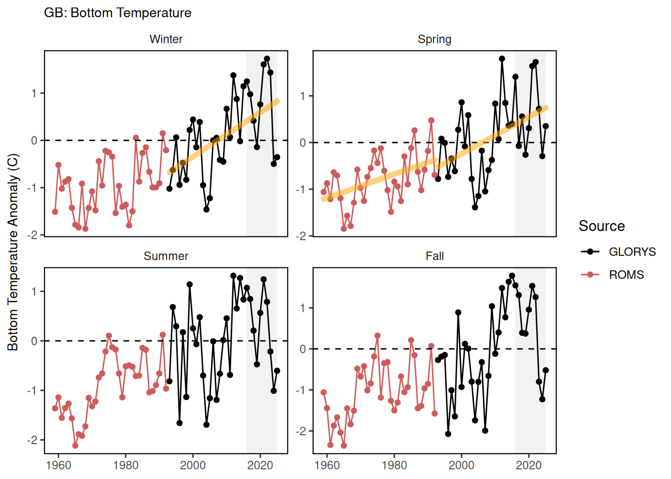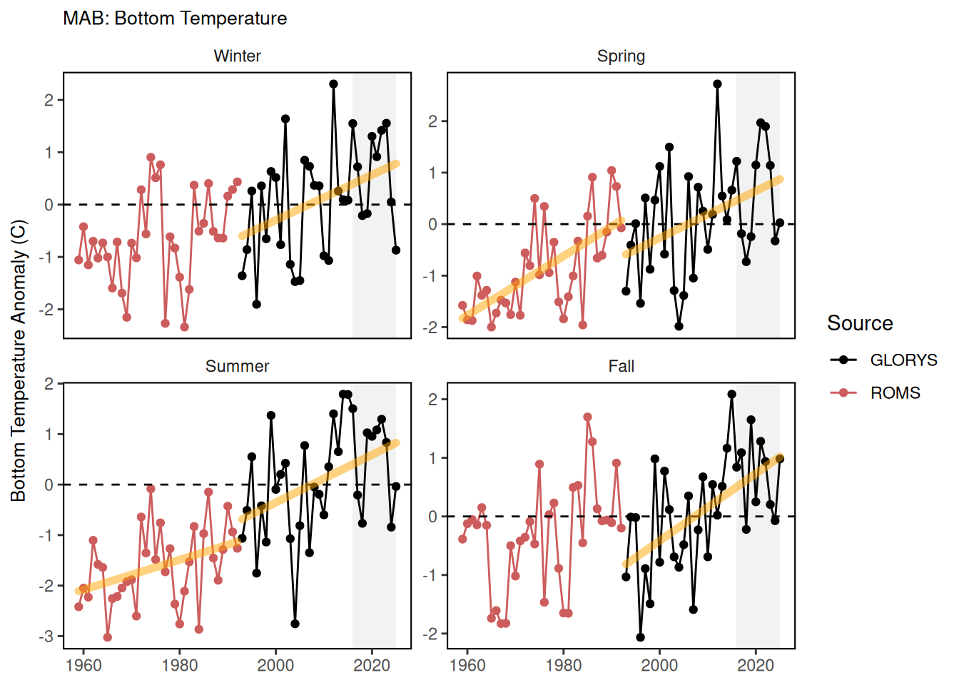 MOM6 Here we show the seasonal temperature anomalies in the Mid Atlantic Bight (MAB), Georges Bank (GB) and Gulf of Maine (GOM) EPUs. Data from 1959 through 1992 are from the biased corrected ROMS dataset ([53]). Data from 1993 through 2019 are from MOM6 ([54]), and 1993 through 2023 are from GLORYS12 reanalysis ([55]). For the anomaly plots the climatology period is 1990 through 2020.
