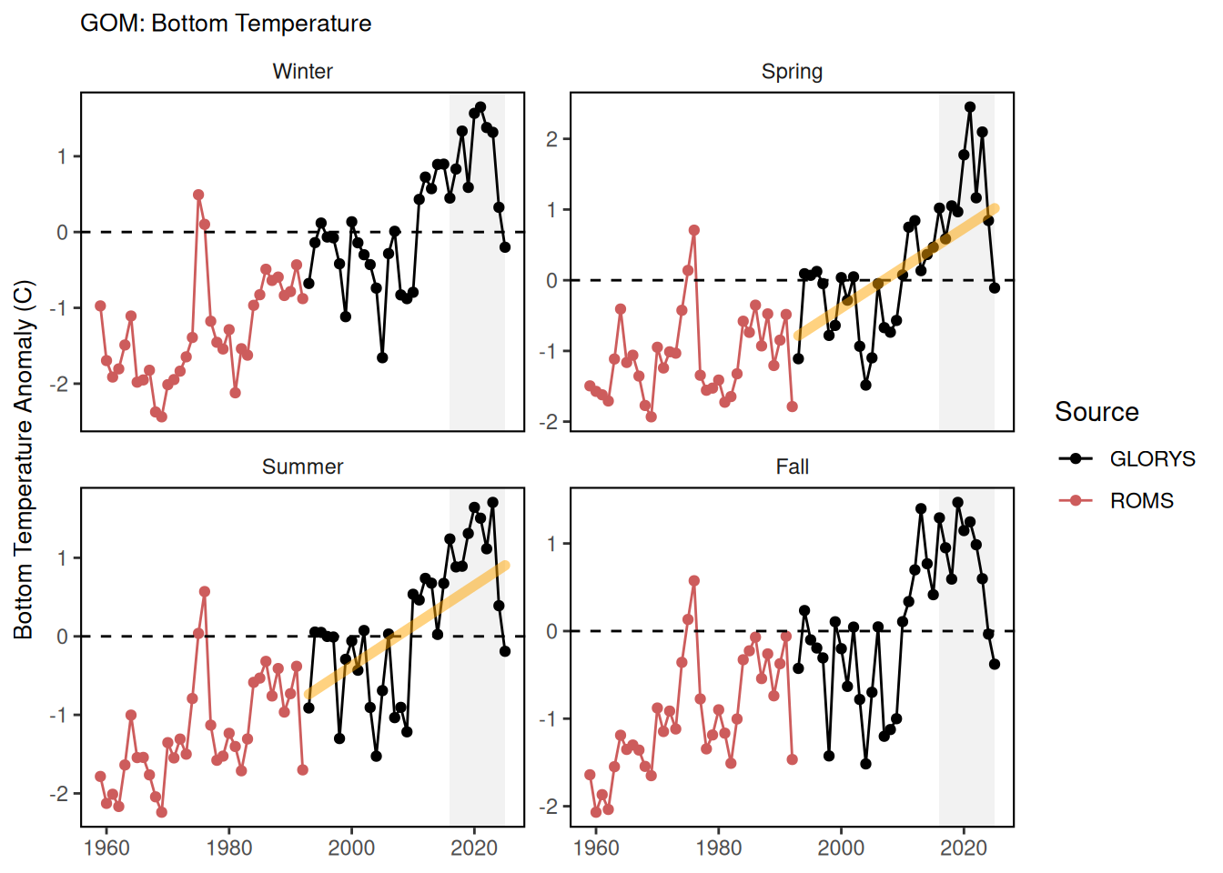 The MOM6 model hindcast does a good job at reproducing seasonal bottom temperature anomalies calculated from GLORYS12 reanalysis data. Because the 1959 through 1992 ROMS was biased corrected using the GLORYS12 dataset, calculating seasonal climatologies using primarily MOM6 data introduces a new, different bias. The differing ability of the model to accurately reproduce bottom temperature during different seasons also likely contributes to the discrepancies between the two time series in the annual bottom temperature plots.