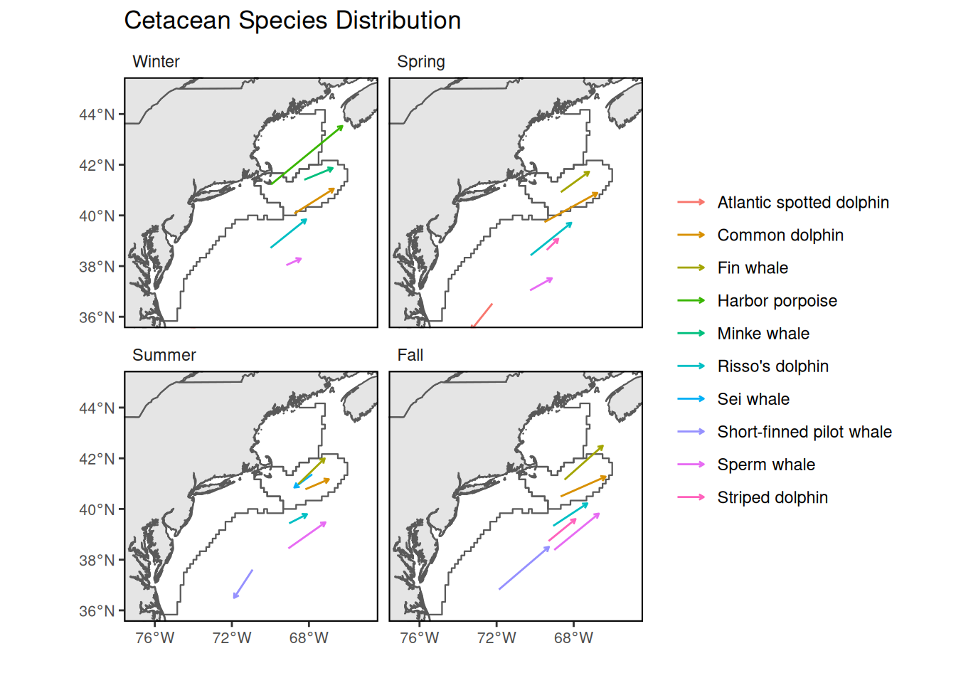 For seasons and cetacean species with movements greater than 70 km, the season plots show the direction and magnitude of core habitat shifts. The locations of the tip and end of the arrow is the seasonal weighted centroid locations for 2010 (end of arrow) and 2017 (tip of arrow). The longer the arrow the more the seasonal shift in distribution. For species that showed a clear displacement of the weighted centroid, the average magnitude of the shift was 178 km shifted towards the northeast and into deeper waters. Bottlenose dolphin habitat showed the most drastic shift for all seasons except during winter: spring= 294 km, summer=505 km, fall= 753 km and winter = 211. There was a clear tendency where the proportion of the estimated population in southern latitudes decreased, while north of 35° the proportion of the estimated population increased, especially during summer 2017. Other species that on average, showed a moderate-to-no spatial shift included humpback whale, minke whale, white-sided dolphin, Sowerby’s beaked whale, and long-finned pilot.