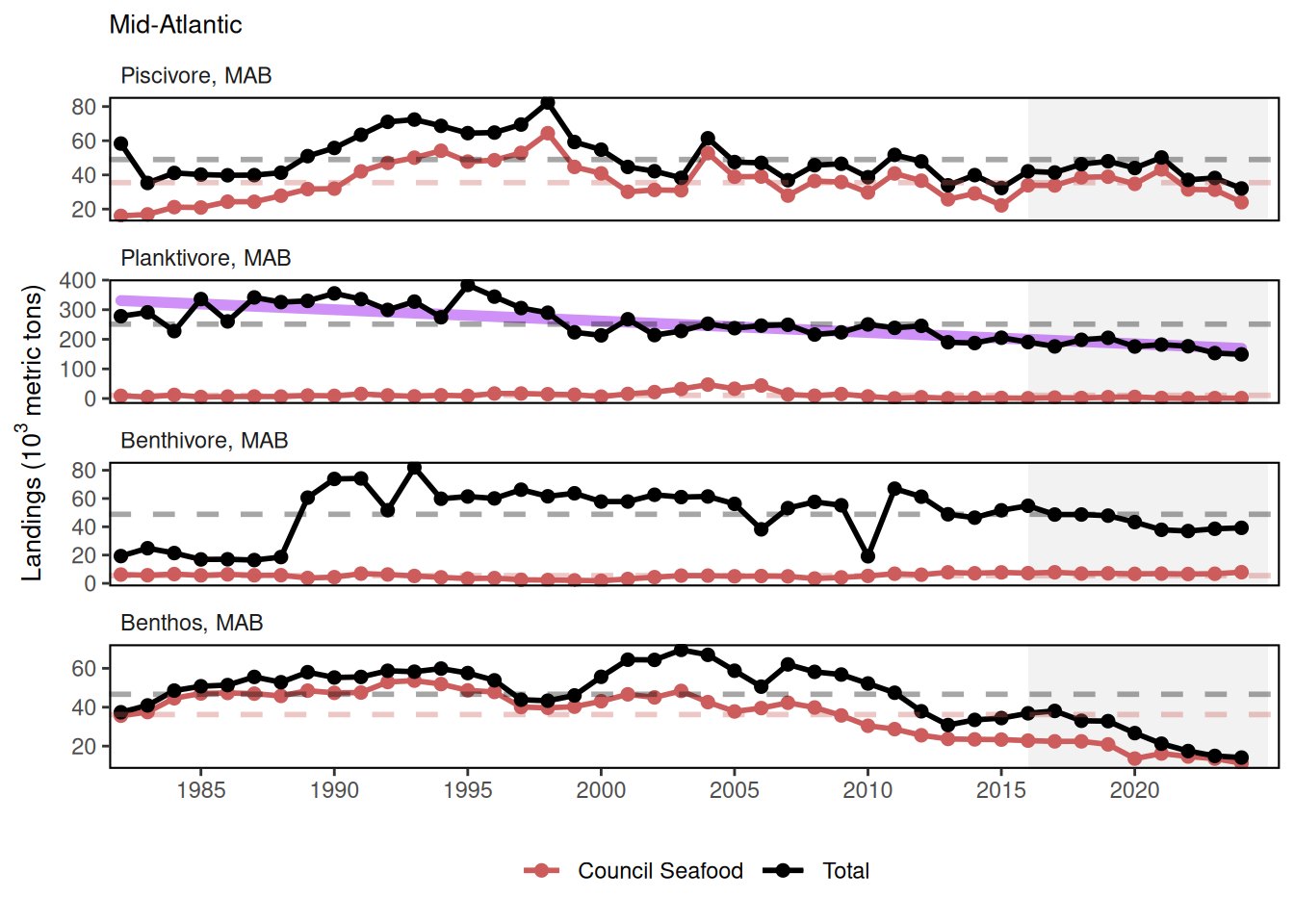 6) Name: Guild Management Body managed species - Landings weight; Definition: Total landings for an aggregate group of managed species within a region. Guilds include Benthivore, Benthos, Other, Piscivore, and Planktivore. Management bodies include Mid-Atlantic Fisheries Management Council (MAFMC), New England Fisheries Management Council (NEFMC), jointly managed by MAFMC and NEFMC (JOINT), and species managed by other entities (Other). For example “Benthivore MAFMC managed species - Landings weight”; Units: metric tons