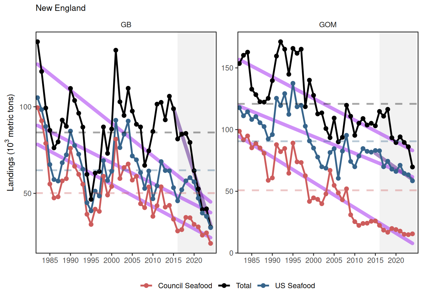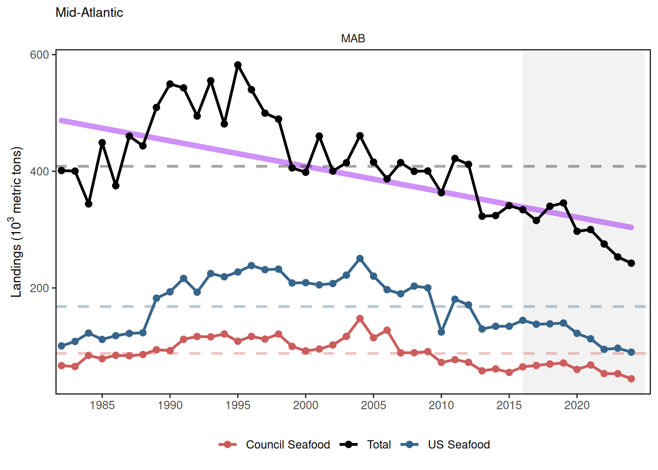 Landings is a key indicator of the State of the Ecosystem report. It is the key driver in fisheries and is impacted by many of the other indicators presented throughout the report. Changes in landings can occur from a number of different factors including but not limited to the underlying ecosystem, changes in climate, fisheries economics, and management measures.