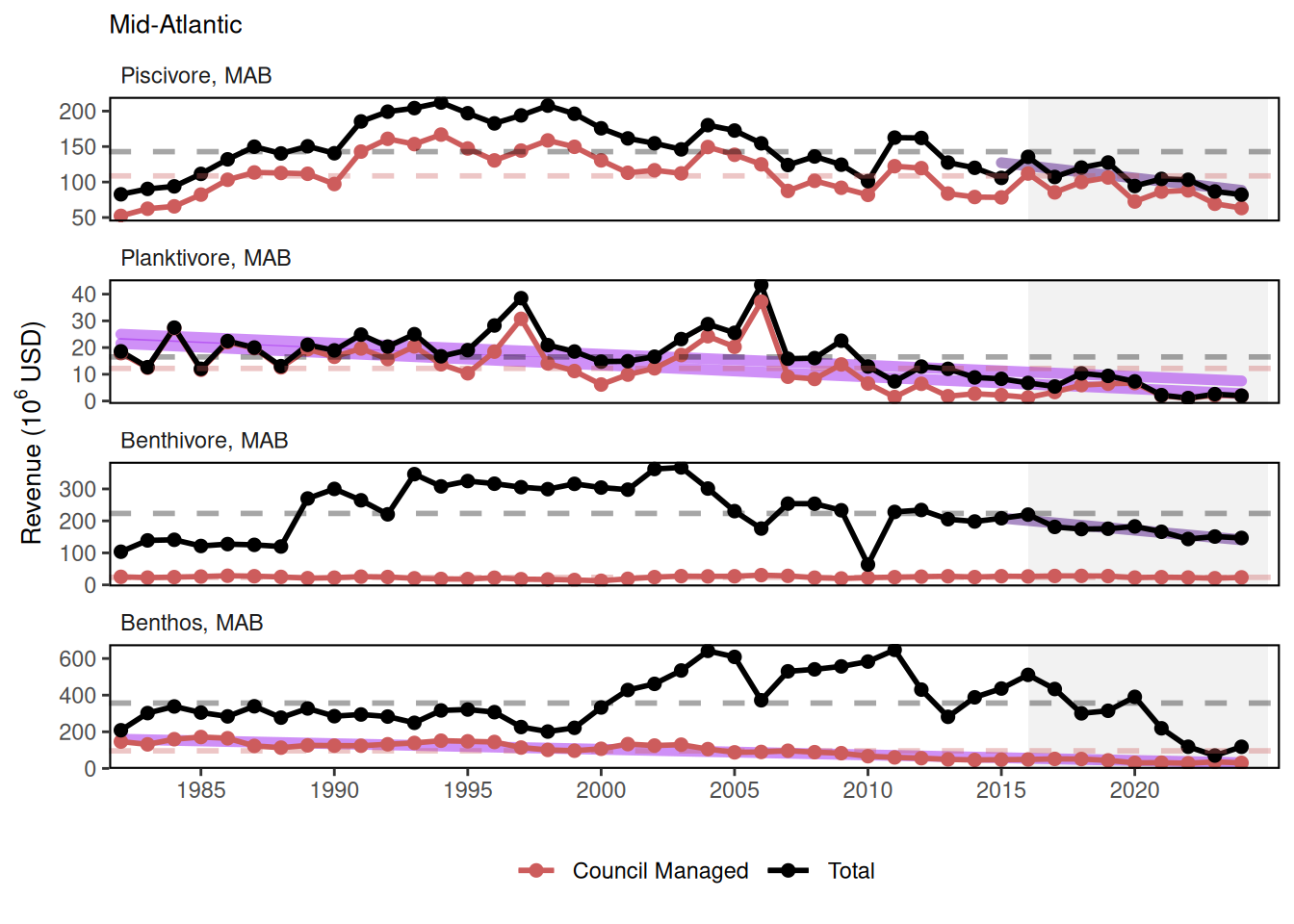 The Northeast US has a long, rich history of commercial fishing. Species of all different types are caught using a plethora of different fishing gear from North Carolina to Maine. This data set aggregates the value of those landings adjusted for inflation to the start of the report year. Revenue is calculated by total and managed by the Mid-Atlantic Fisheries Management Council and New England Fisheries Management Council. Revenue can be visualized by feeding guilds as well as by region.