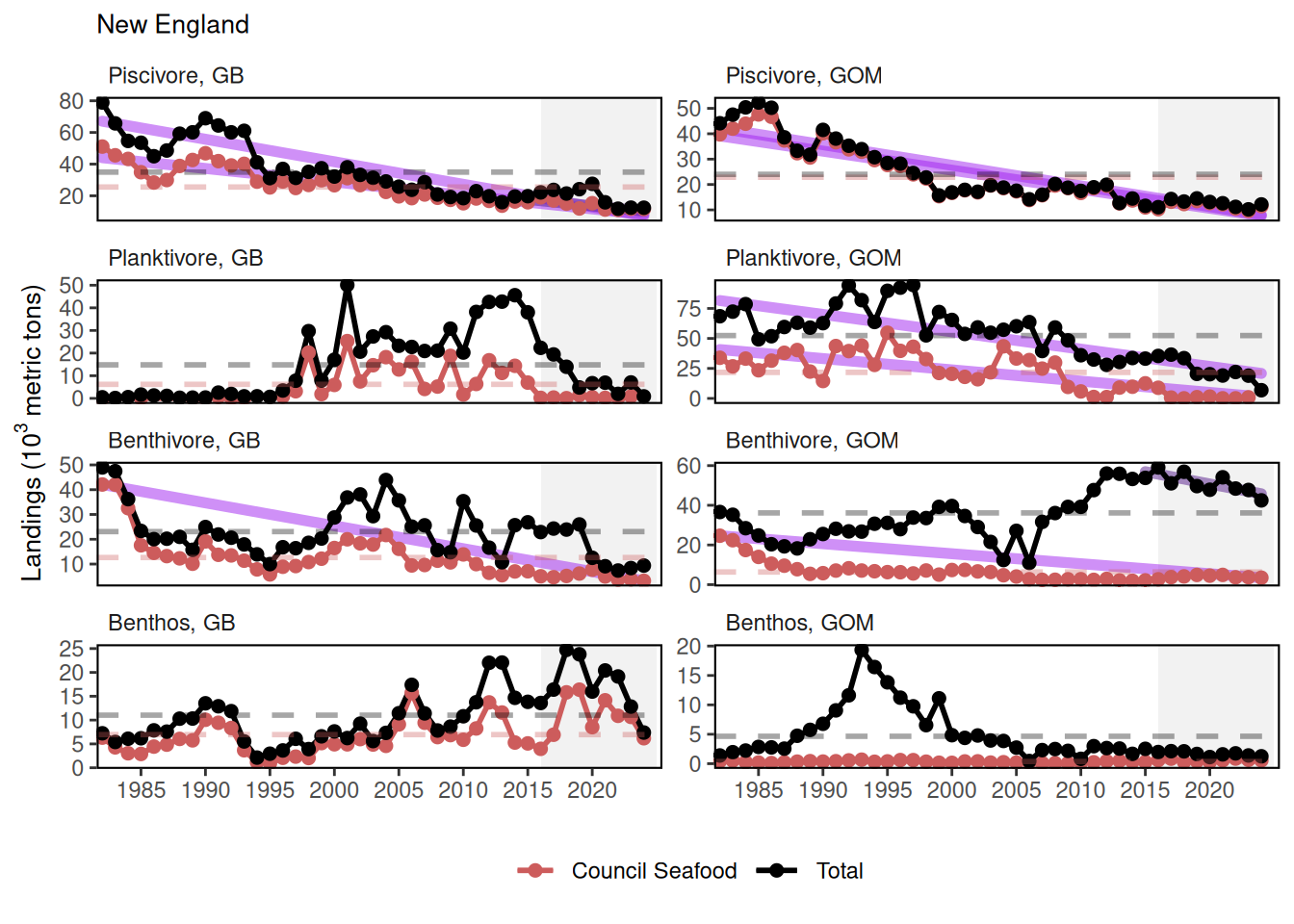 8) Name: Guild Management Body managed species - Seafood Landings; Definition: Total landings for an aggregate group of managed species within a region used for human consumption. Guilds include Benthivore, Benthos, Other, Piscivore, and Planktivore. Management bodies include Mid-Atlantic Fisheries Management Council (MAFMC), New England Fisheries Management Council (NEFMC), jointly managed by MAFMC and NEFMC (JOINT), and species managed by other entities (Other). For example “Benthivore MAFMC managed species - Seafood Landings”; Units: metric tons