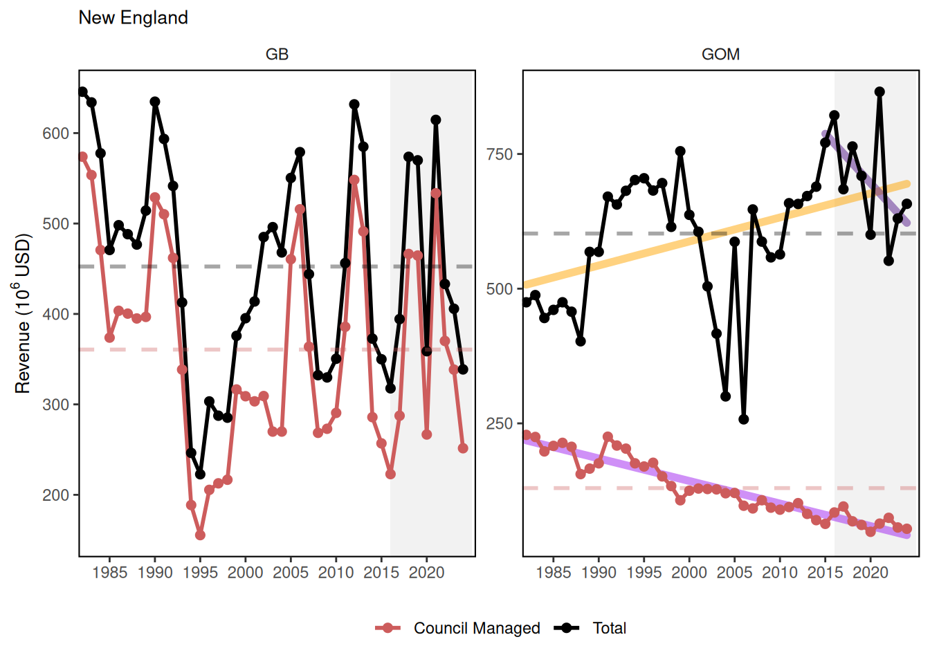 Commercial revenue by managed species has generally been down. The exception is on Georges Bank where there is a cyclical nature to revenue arising from rotational scallop management. Total fisheries revenue in the Gulf of Maine has been increasing while total revenue has declined in the Mid-Atlantic.