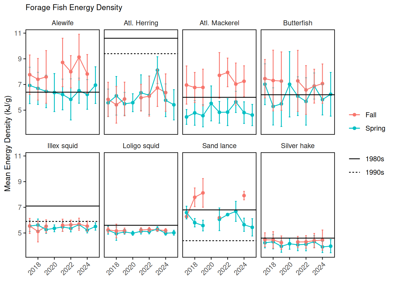 The line plots depict the mean energy density (kJ/g wet weight) for eight species across seasons and years. The black reference lines denote estimates from prior studies where available for comparison. The energy density of Atlantic herring from the NEFSC trawl surveys increased to over 7 kJ/g wet weight in spring 2023, declined since, and remains below estimates from the 1980s and 1990s (10.6-9.4 kJ/ g wet weight). Silver hake, inshore longfin squid (Loligo in figure), and northern shortfin squid (Illex in figure) remain lower than previous estimates [40,41]. Energy density of alewife, butterfish, northern sand lance, and Atlantic mackerel varies seasonally, with seasonal estimates both higher and lower than estimates from previous decades.