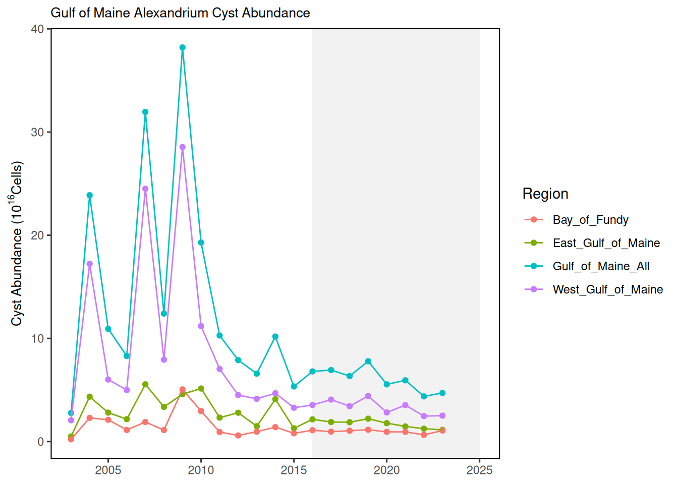 Description: These data represent annual estimated abundance of Alexandrium catanella cysts in the Gulf of Maine from 2003 to 2023.