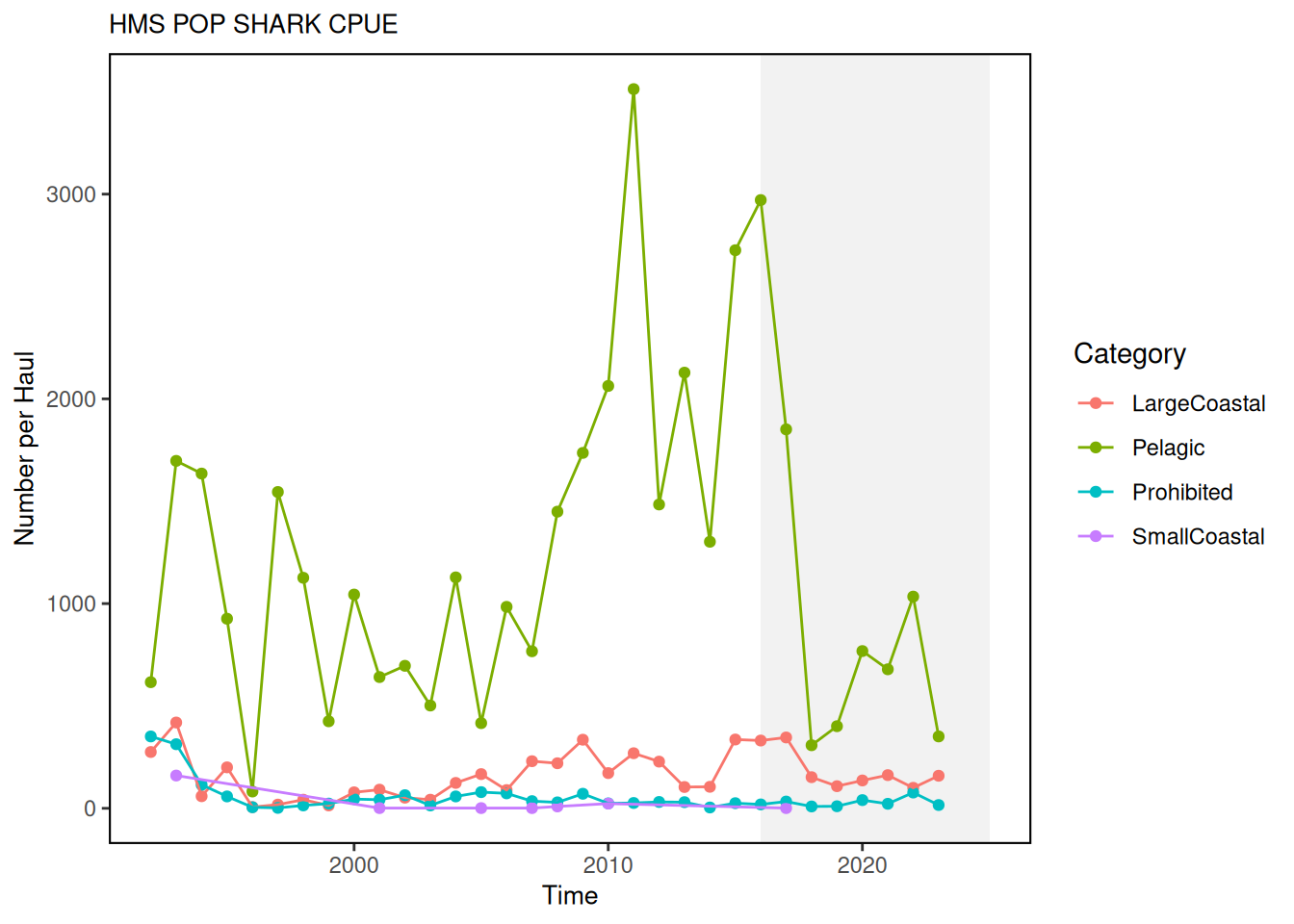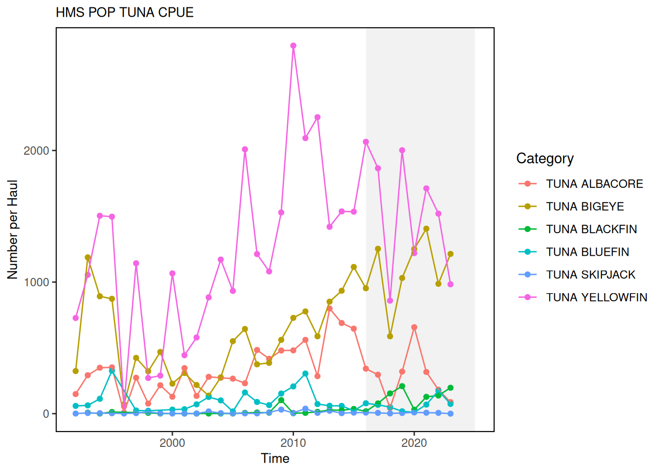 Description: CPUE from pelagic observer program (POP) observed hauls, presented as number of fish per haul, by year and species from 1992-2024.
