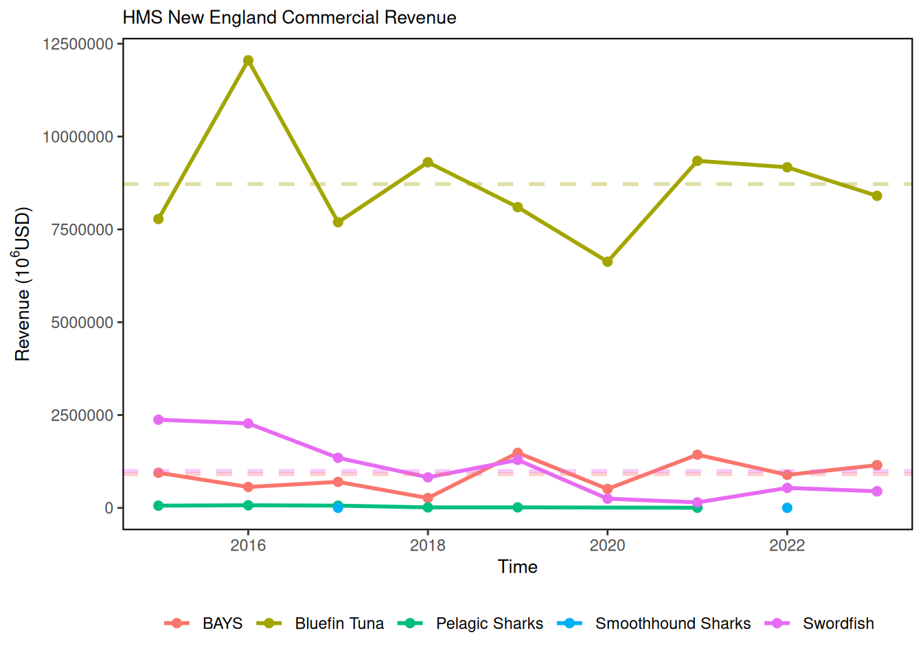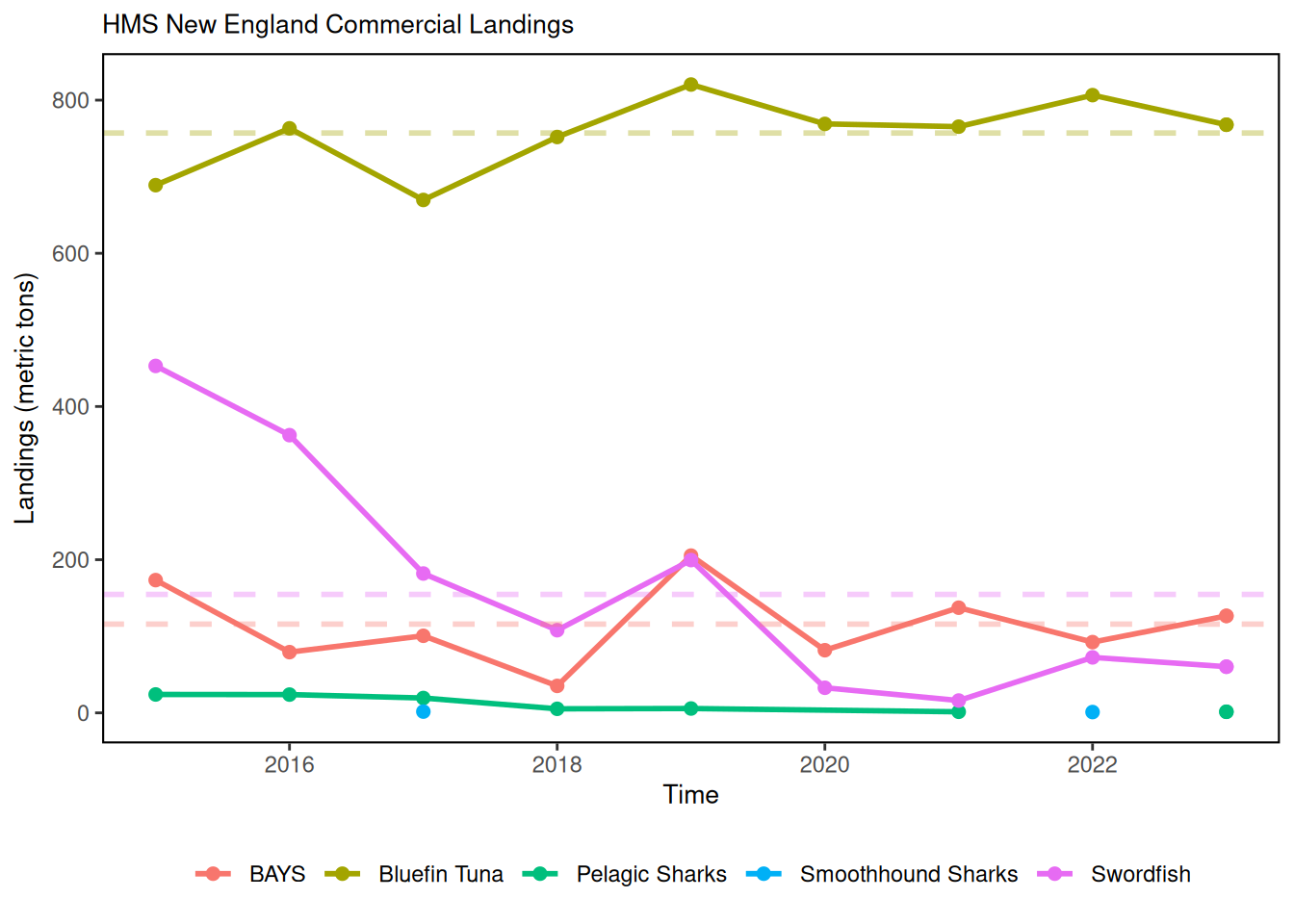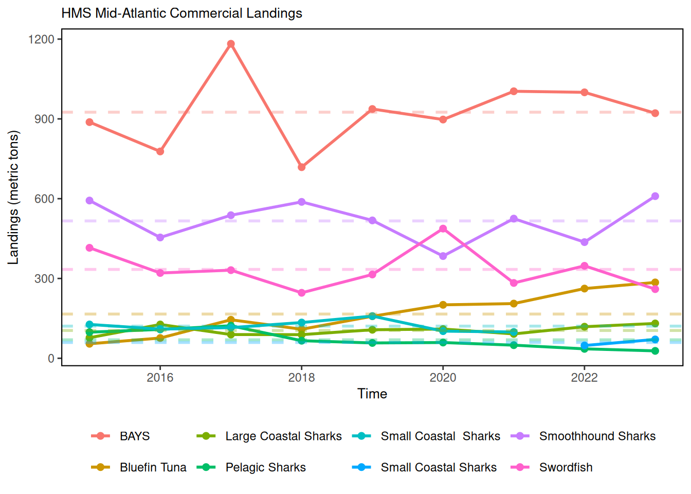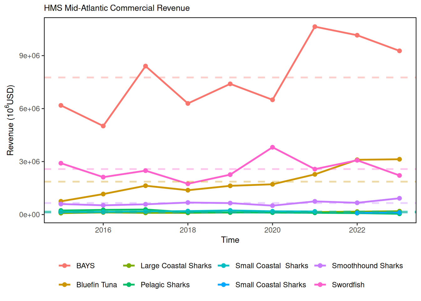 There are 53 species managed under the Highly Migratory Species (HMS) Fishery Management Plan. Aggregated Atlantic HMS landings data of swordfish, sharks, bluefin tuna, and BAYS (bigeye, albacore, yellowfin, skipjack) tunas were prepared for the Fisheries of the United States (FUS) report, were used for the Status of the Ecosystem report, spanning 2015-2024. FUS is considered to be the annual NOAA Fisheries yearbook of fisheries statistics. It provides a snapshot of data, primarily at the national level, on U.S. recreational catch and commercial fisheries landings and value. The FUS process has since been the vehicle used by HMS staff to QA/QC shark, swordfish, the “BAYS” tunas (bigeye, albacore, yellowfin and skipjack), and bluefin tuna data for all future HMS Division products. Economic data produced for this report forms the basis for all economic data used in other reports or products. This indicator therefore provides the best comprehensive summary of commercial landings and revenue information for HMS fisheries that target or retain tunas, swordfish, and sharks. These data can be evaluated independently, and can also be included in overall estimates of commercial fisheries landings in the northeast region.
