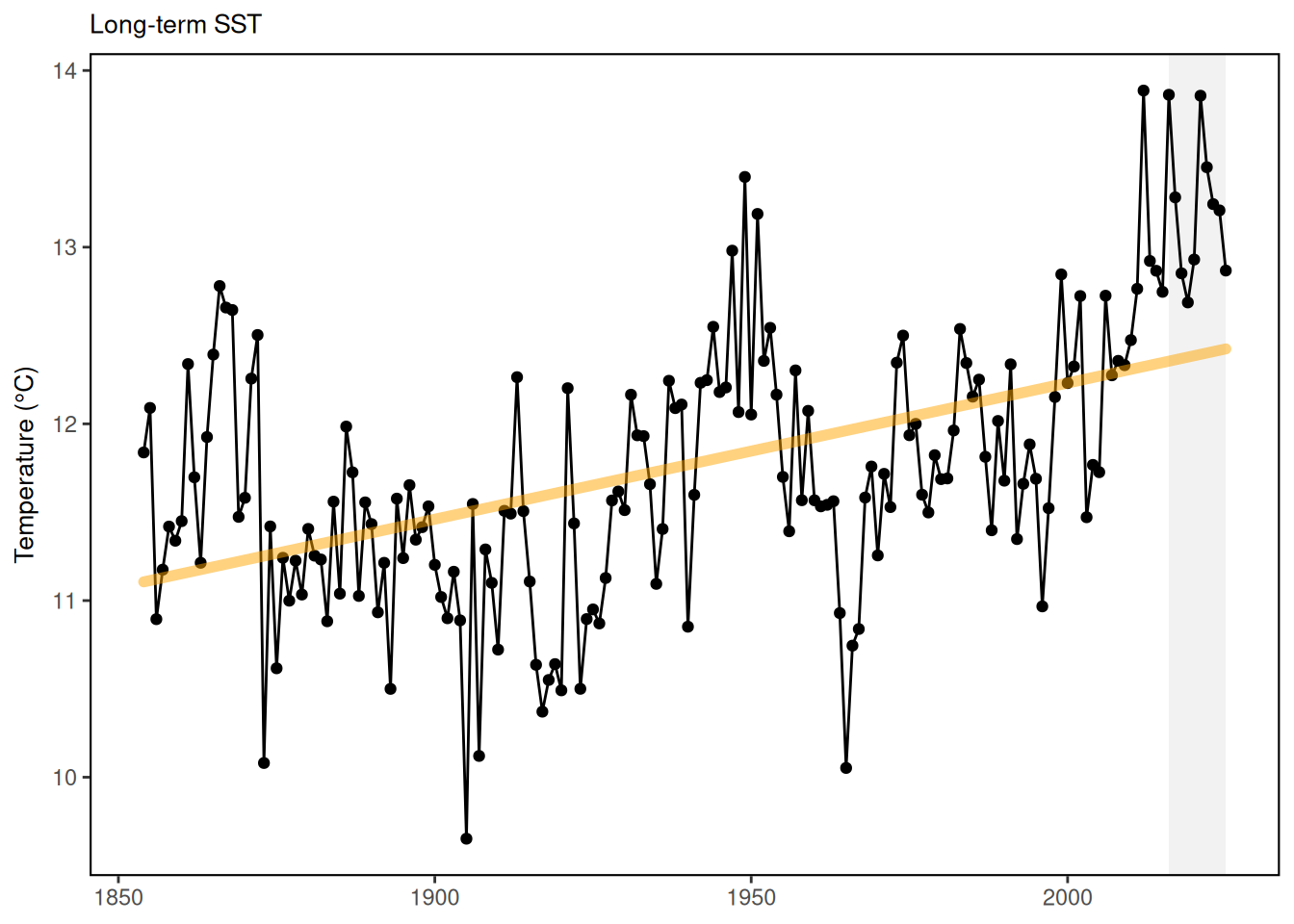 Since the 1860’s, the Northeast US shelf sea surface temperature (SST) has exhibited an overall warming trend, with the past decade measuring well above the long term average.