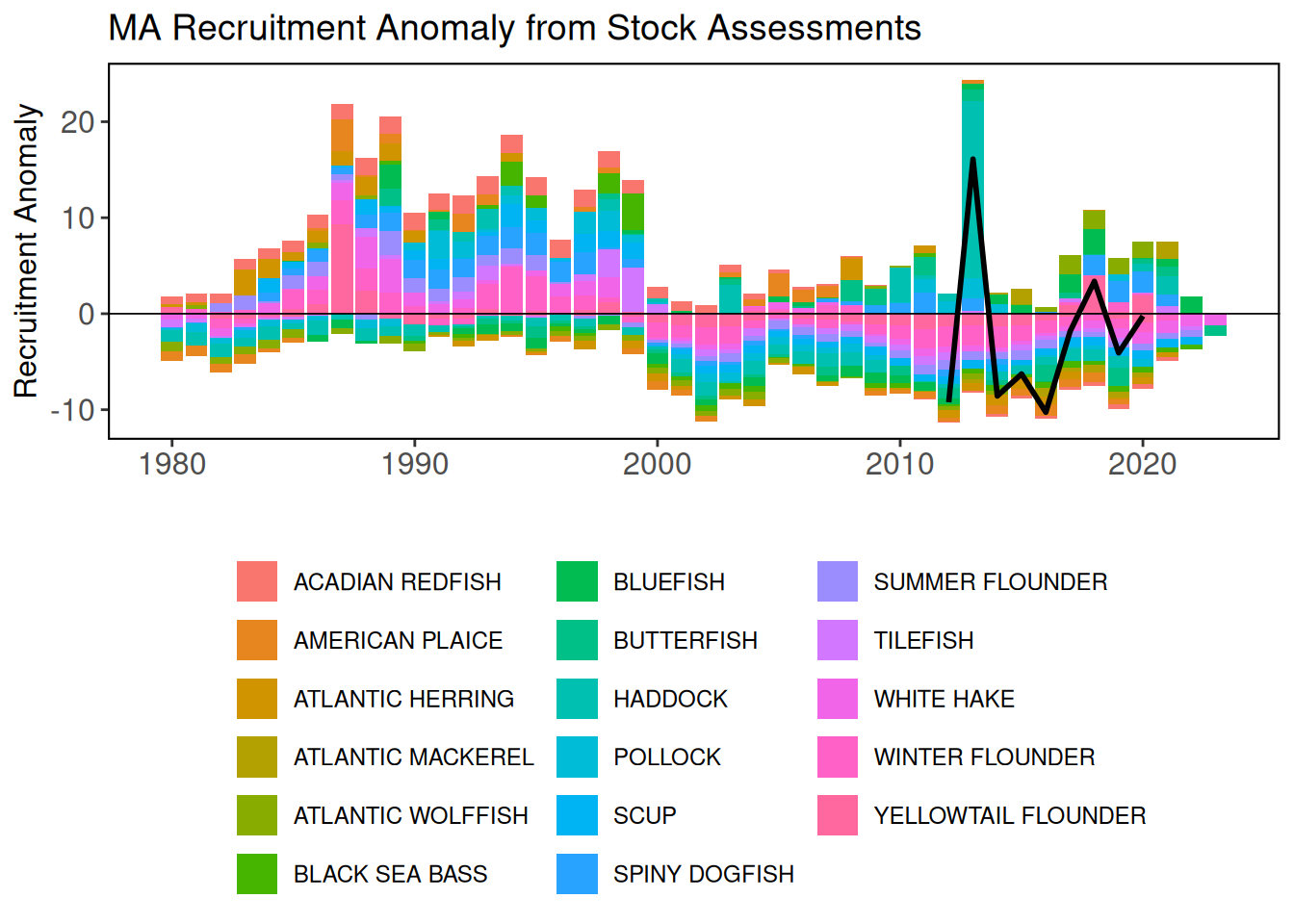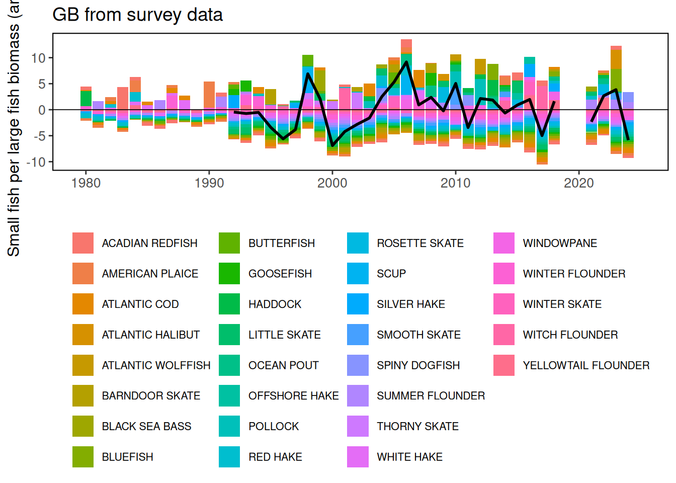 The apparent decline in productivity across multiple managed species in the MAB, along with generally poor fish conditions in 2024, also suggest changing ecosystem productivity at multiple levels. During the 1990s high relative abundance of smaller bodied copepods and a lower relative abundance of Calanus finmarchicus was associated with regime shifts to higher fish recruitment [8]. The unprecedented climate signals along with the trends toward lower productivity across multiple managed species indicate a need to continually evaluate whether management reference points remain appropriate, and to evaluate if ecosystem regime shifts have occurred or reorganization is in progress.
