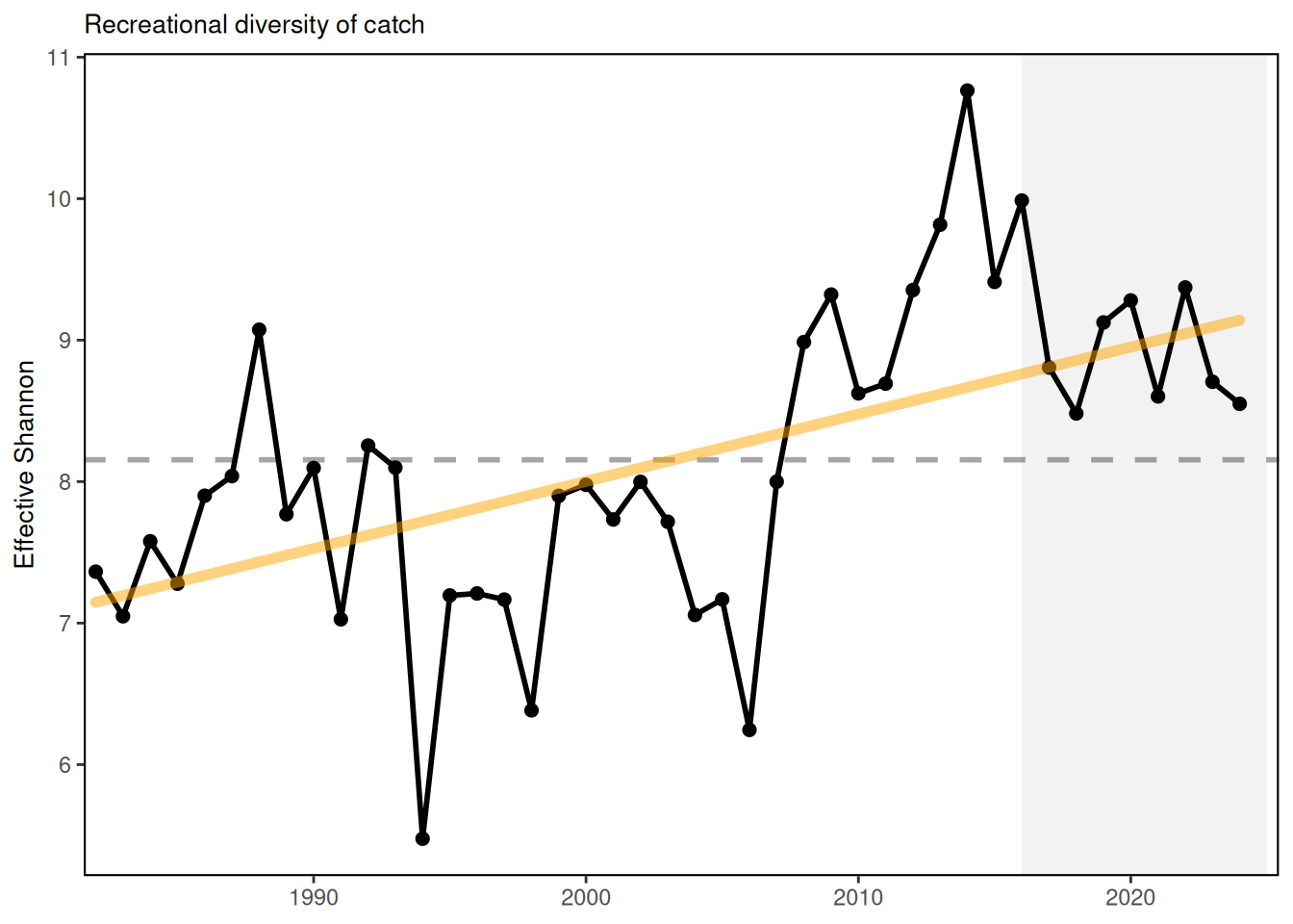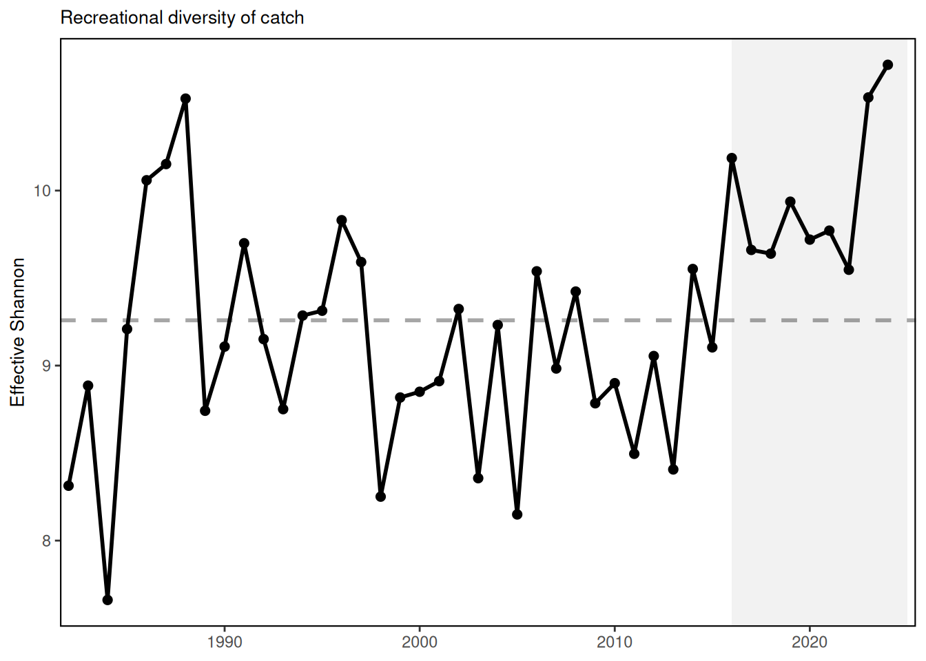In New England, recreational species catch diversity has been above the time series average since 2008 with a long-term positive trend. In the Mid-Atlantic, recreational species catch diversity has no long term trend so is considered stable, and has been at or above the long term average in 9 of the last 10 years.