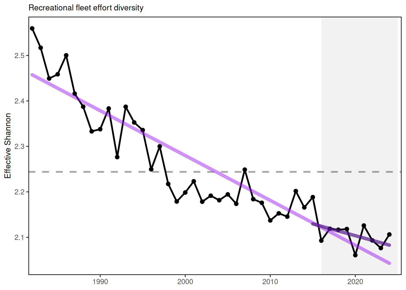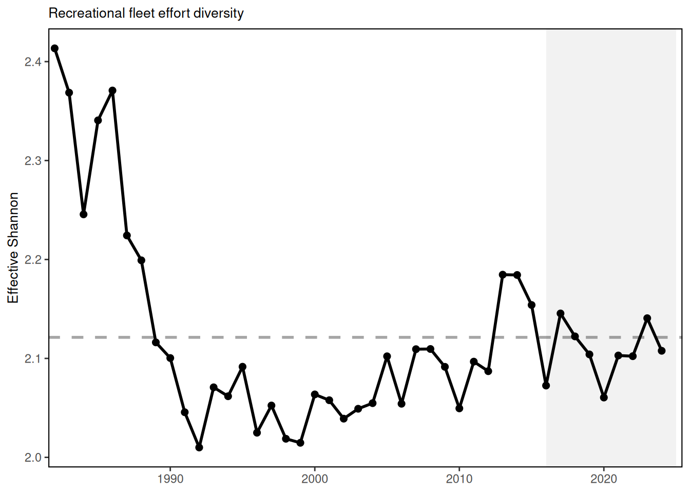 Diversity indices can be used to evaluate stability objectives as well as risks to fishery resilience and to maintaining equity in access to fishery resources. In New England, the absence of a long term trend in recreational angler trips and fleet effort diversity suggests relative stability in the overall number of recreational opportunities in the region. While the overall number of angler trips in the MAB is above the long-term average, the continuing decline in recreational fleet effort diversity suggests a potentially reduced range of recreational fishing options. The downward effort diversity trend is driven by party/charter contraction (currently below 2% of trips), and a shift toward shore-based angling, which currently makes up 59% of angler trips. Effort in private boats remains stable at around 40% of trips. Changes in recreational fleet diversity can be considered when managers seek options to maintain recreational opportunities. Shore anglers will have access to different species than vessel-based anglers, and when the same species is accessible both from shore and from a vessel, shore anglers typically have access to smaller individuals. Many states have developed shore-based regulations where the minimum size is lower than in other areas and sectors to maintain opportunities in the shore angling sector.