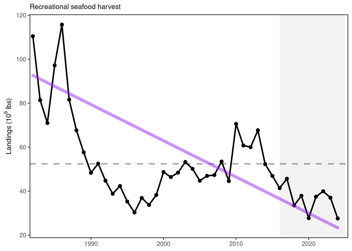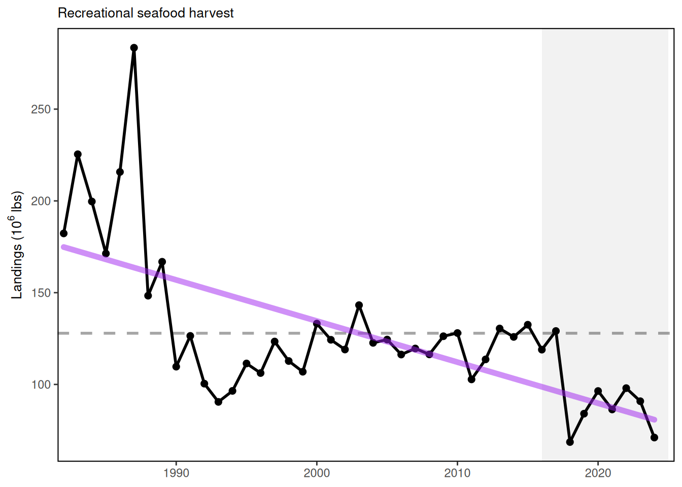 Description: A variety of indicators derived from MRIP Recreational Fisheries Statistics, including total recreational catch, total angler trips by region, annual diversity of recreational fleet effort, and annual diversity of managed species.