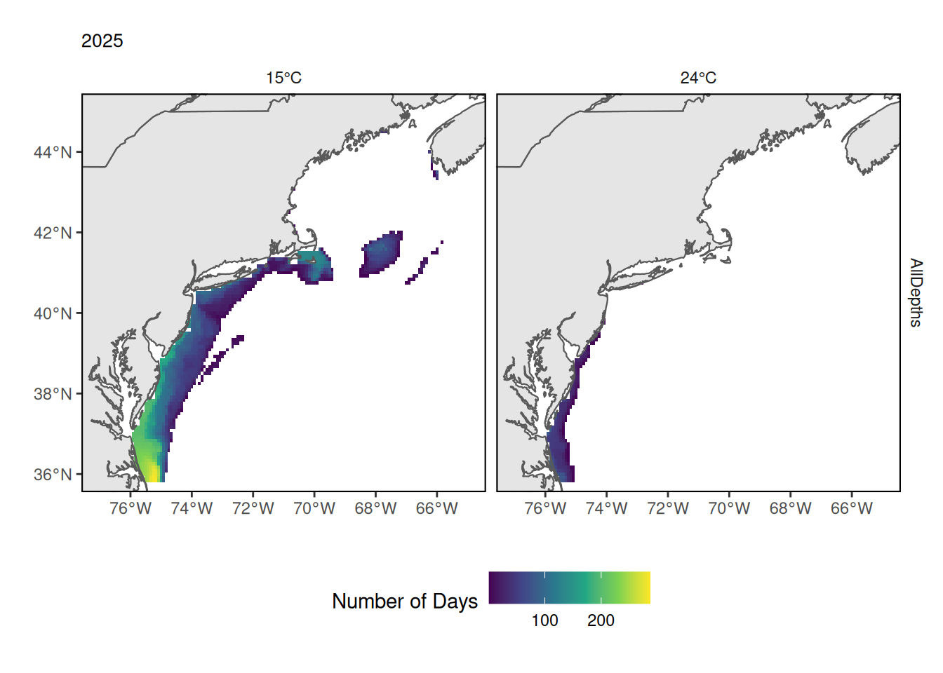 Maps of full NE shelf with cells shading gradient showing number of days exceeding temperature thresholds. For 15C threshold, much of the southern MAB, the shelf break and Nantucket Shoals experienced >100 days. In 2023, only the southern and/or shallow portion of the MAB exceeded the 24C threshold.