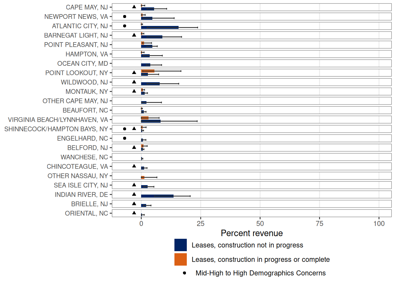 Mid Atlantic ports derive 0-17% of their revenue from wind lease areas that are under construction or fully developed. Point Lookout, NY is the only port that derives an average of >5% of its revenue from wind lease areas that are under construction or fully developed. The lease areas that have not yet been developed represent 0-24% of port revenue for Mid Atlantic ports. Indian River, DE, Atlantic City, NJ, Virginia Beach/Lynnhaven, VA, Barnegat Light, NJ, Wildwood, NJ, and Cape May, NJ are the ports that derive an average of >5% of their revenue from wind lease areas that are not currently under construction.