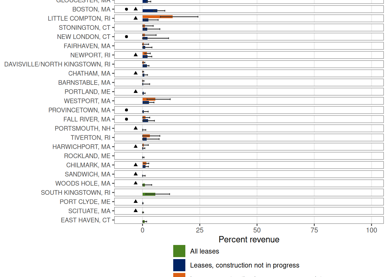 Additionally, there are 4 New England ports that meet the reporting criteria when revenue is assessed across all lease areas combined (fully developed or under construction, and construction not yet begun): South Kingstown, RI, Woods Hole, MA, Scituate, MA, and East Haven, CT. Due to confidentiality restrictions, we cannot distinguish whether this revenue is coming from lease areas where construction has already begun or if the revenue derives from regions that have not yet begun construction activities. South Kingstown, RI has the highest percentage of port revenue derived from wind lease areas at 1-12% (average 6%). The other ports have 0-4% of their revenue in the wind lease areas, with an average of ≤1% of their revenue from the wind lease areas.