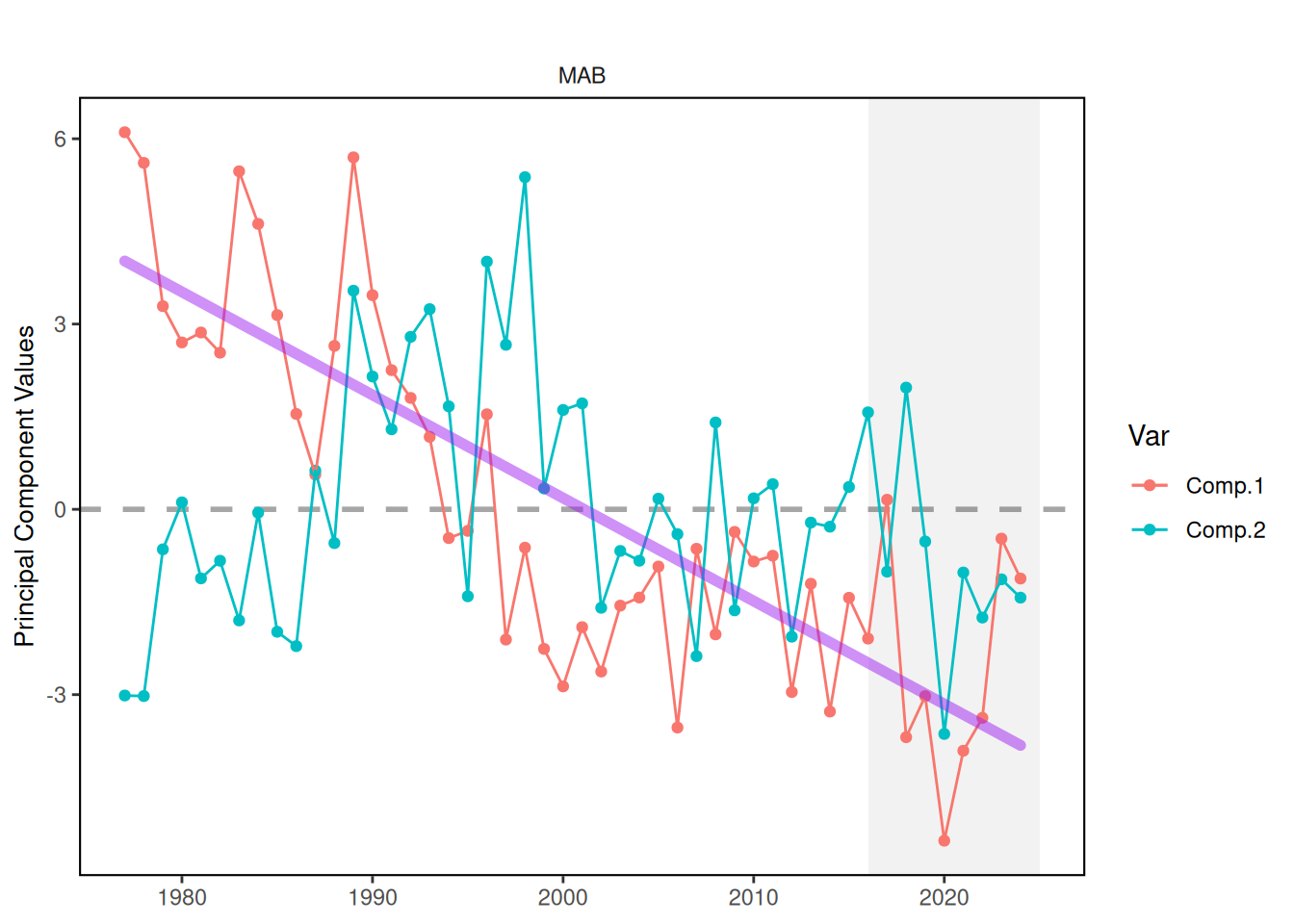 In the MAB, a long term decline in PC1 resulted in a phase change from positve to negative around the year 1997. PC2 was mostly positive from 1985-2002, after which variability was high and PC2 switched between positive and negative phases multiple times over a 10 year period. Both PC1 and PC2 currently remain in a negative phase since 2019. Taxa contributing to this negative phase include a low abundance for Pseudocalanus spp., and higher abundance of hyperiid amphipods, and echinoderms. The amount of variability explained by PC1 and PC2 in the MAB is 32% and 15%, respectively.