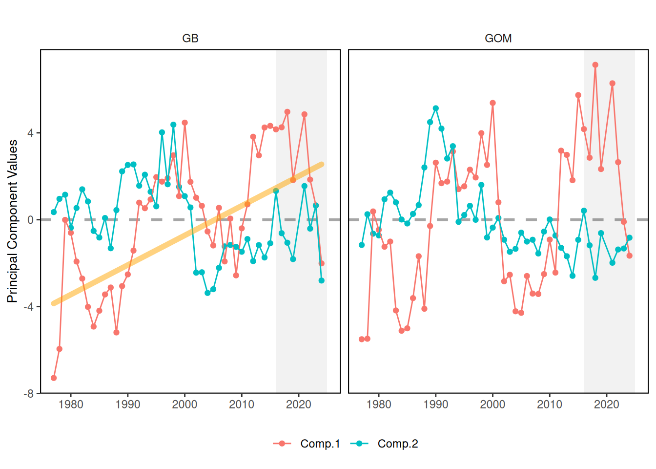 The recent switch in state of PC1 in the GOM and GB may indicate a restructuring of the zooplankton community is underway. These changes may be driven partly by changes in the abundance of Calanus finmarchicus, Centropages typicus, Psuedocalanus spp., and other taxa.